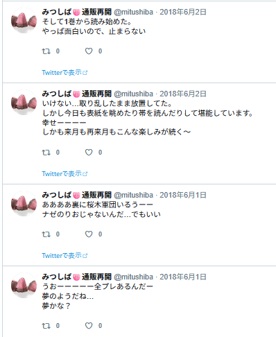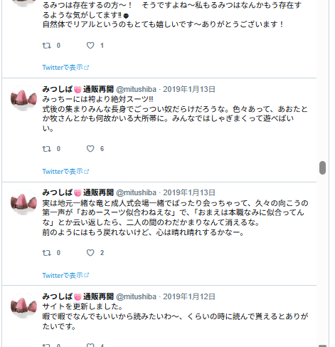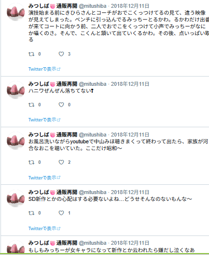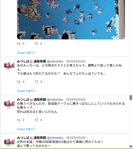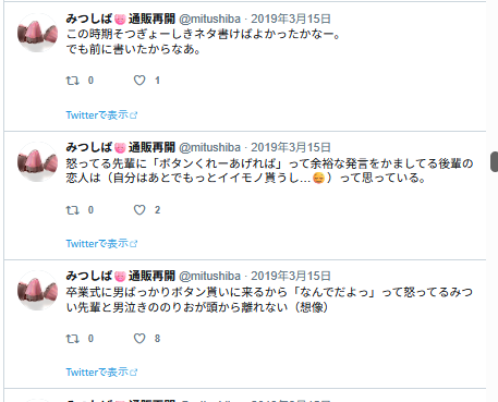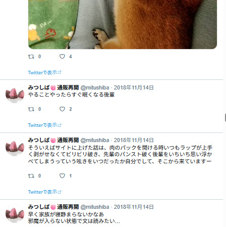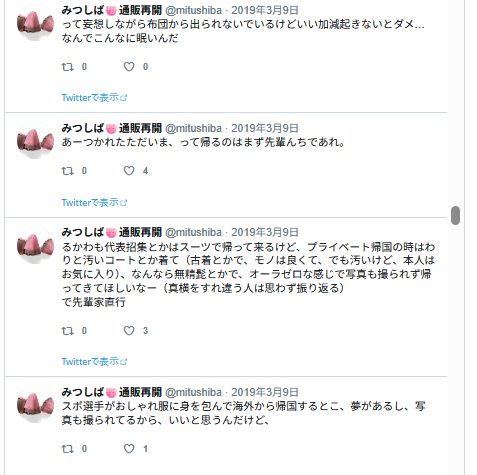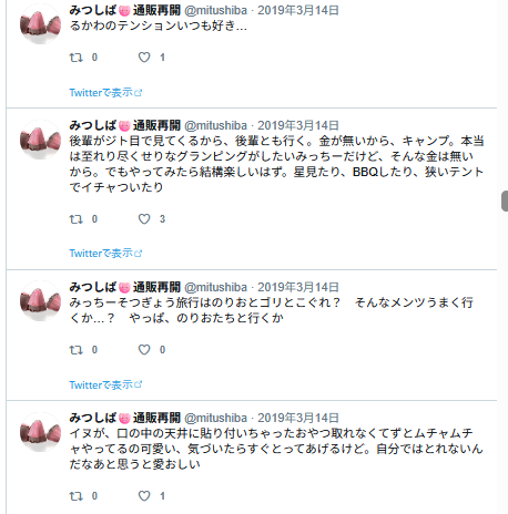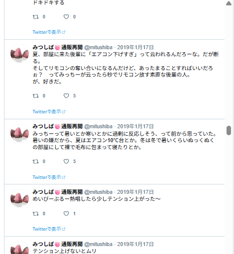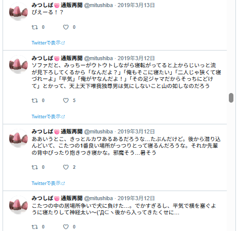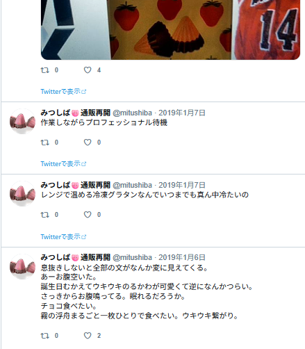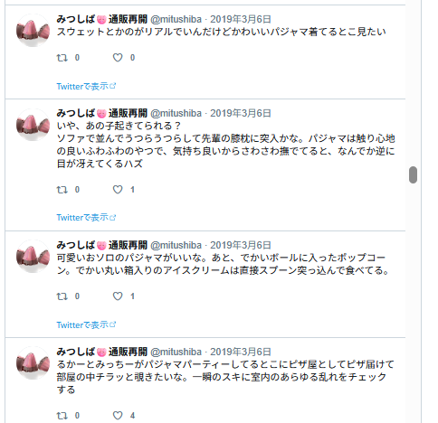 この後フォロワーさんとリプでジェラピケ着てるみつの話になっていって、楽しかった記憶。私ぜんぜん詳しくないので、どういうのがあるとか、いろいろ教えて貰ったような。