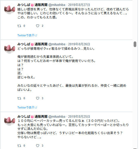 そう云えば私はコミケであの開場の行列に並んだことないな。サークル参加は朝早いけど、買うほうで行くときはいつも昼頃に着くように行ってたので、昼に着けばもう列もなくスムーズに入れたから。絶対に並びたくないマンだから。そして昔のサークルは午後でも大体本が買えた。今とちょっと違うんだよな~。